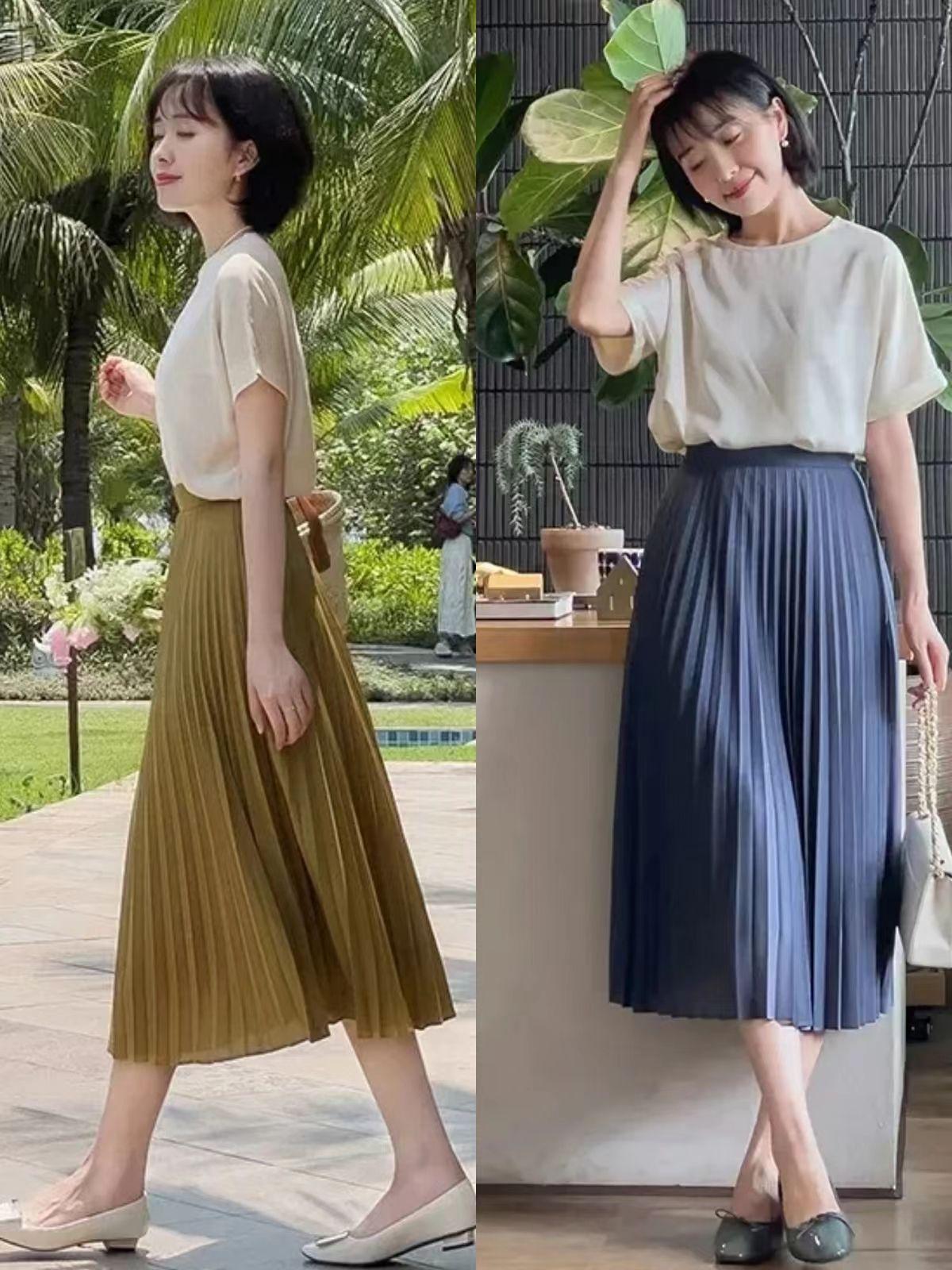 The combination of T-shirt and below-the-knee skirt is This summer is very popular, especially pleated skirts.