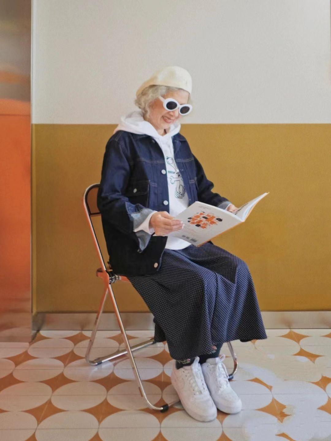 The same fashionable grandma wears a denim jacket layered with a white hooded sweatshirt. The hat, white sneakers and sweatshirt echo each other, making it effortless and elegant. Modern.