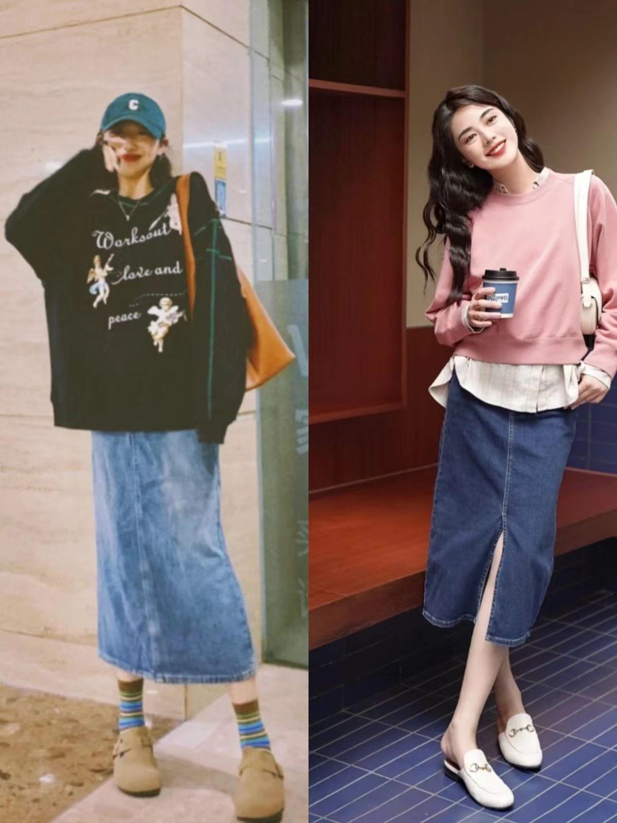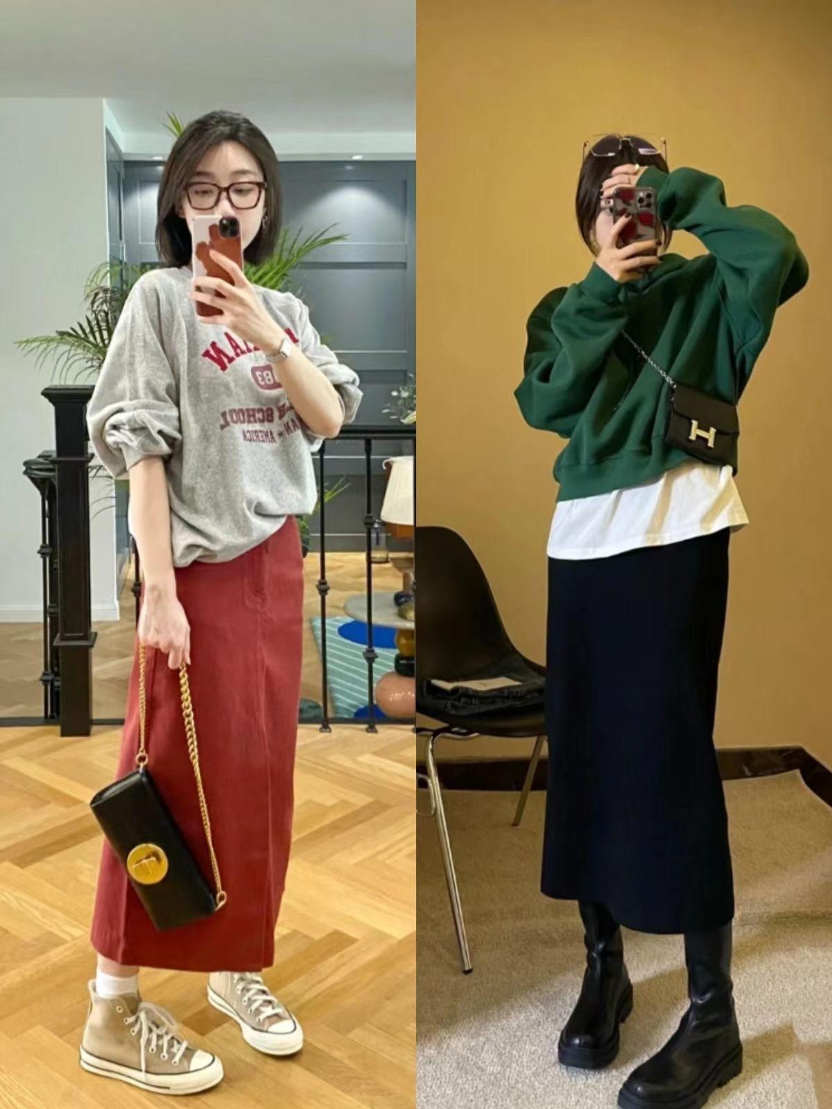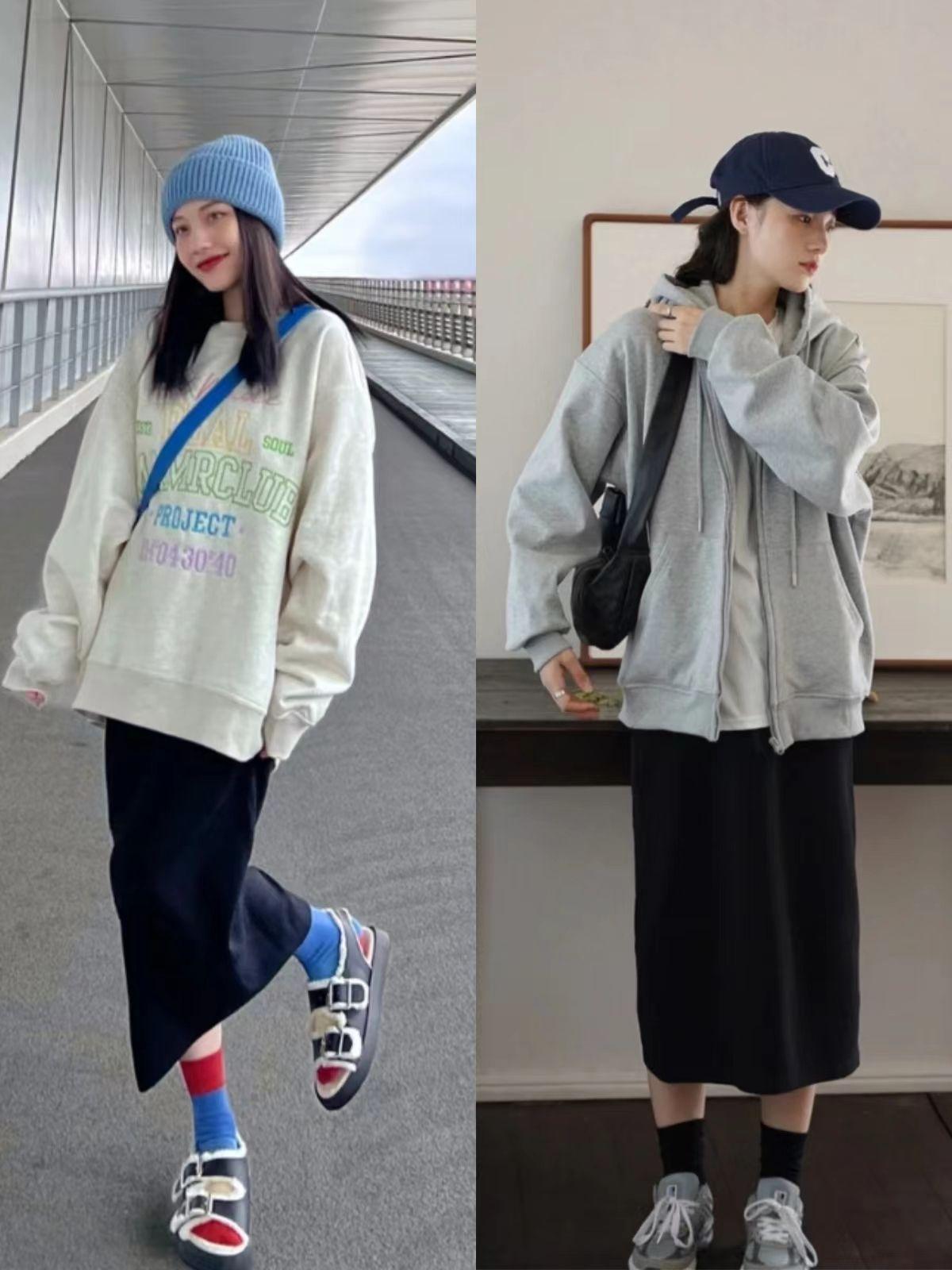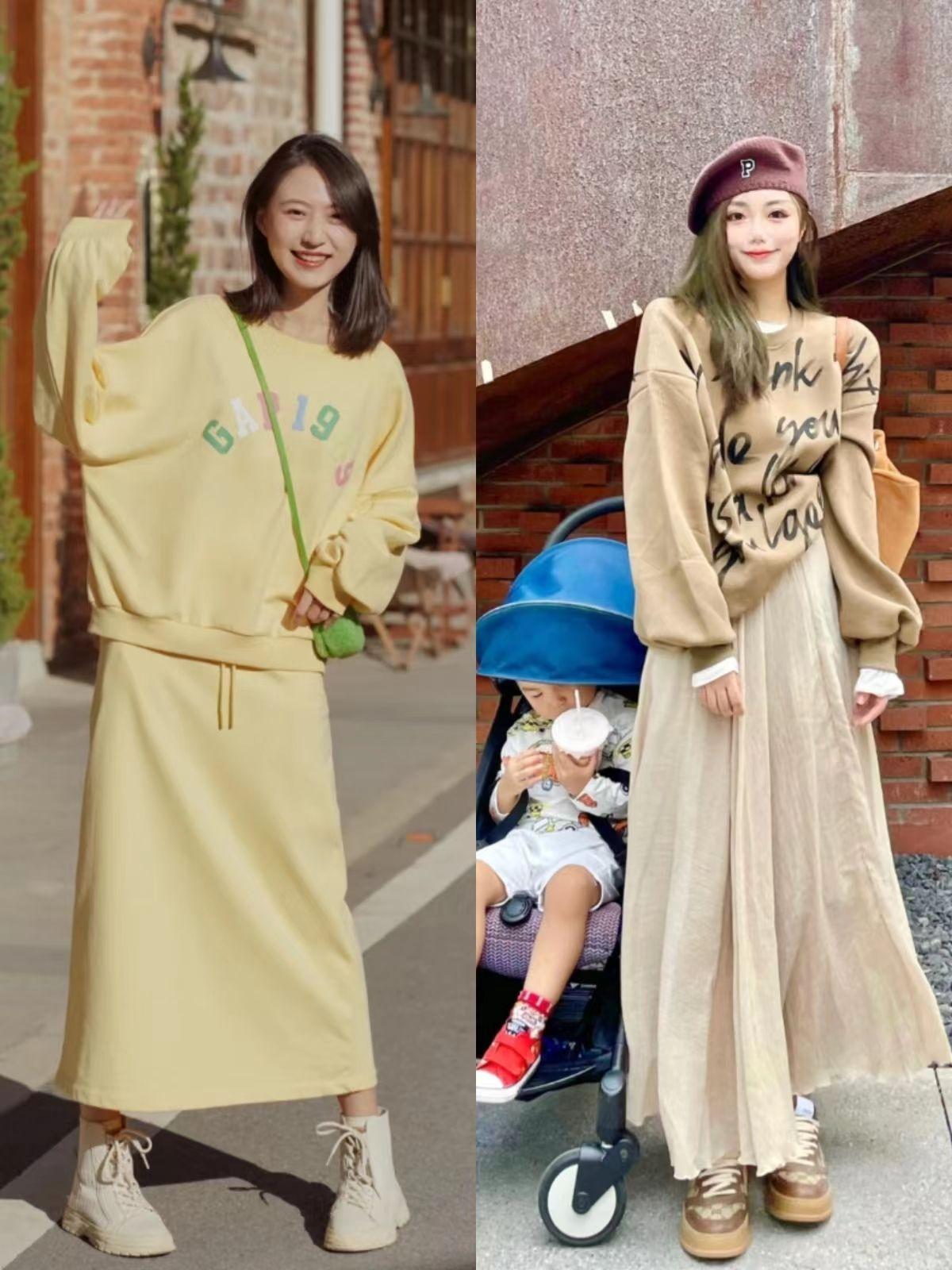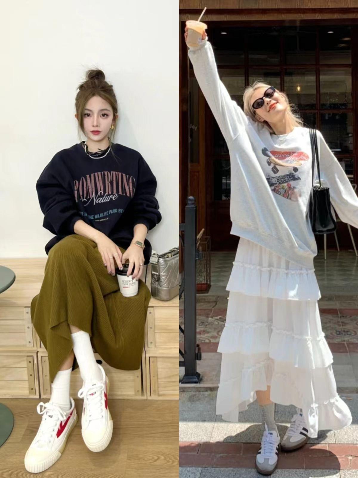1. Sweatshirts are the protagonist of spring. Paired with these below-the-knee skirts, everyone will look stylish