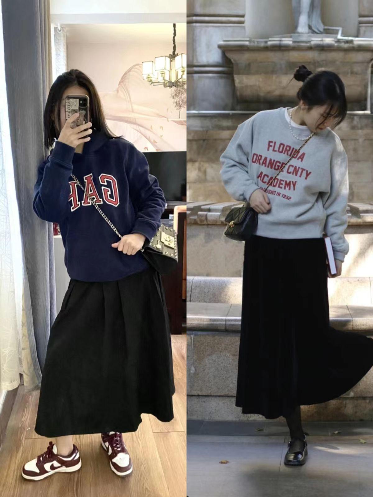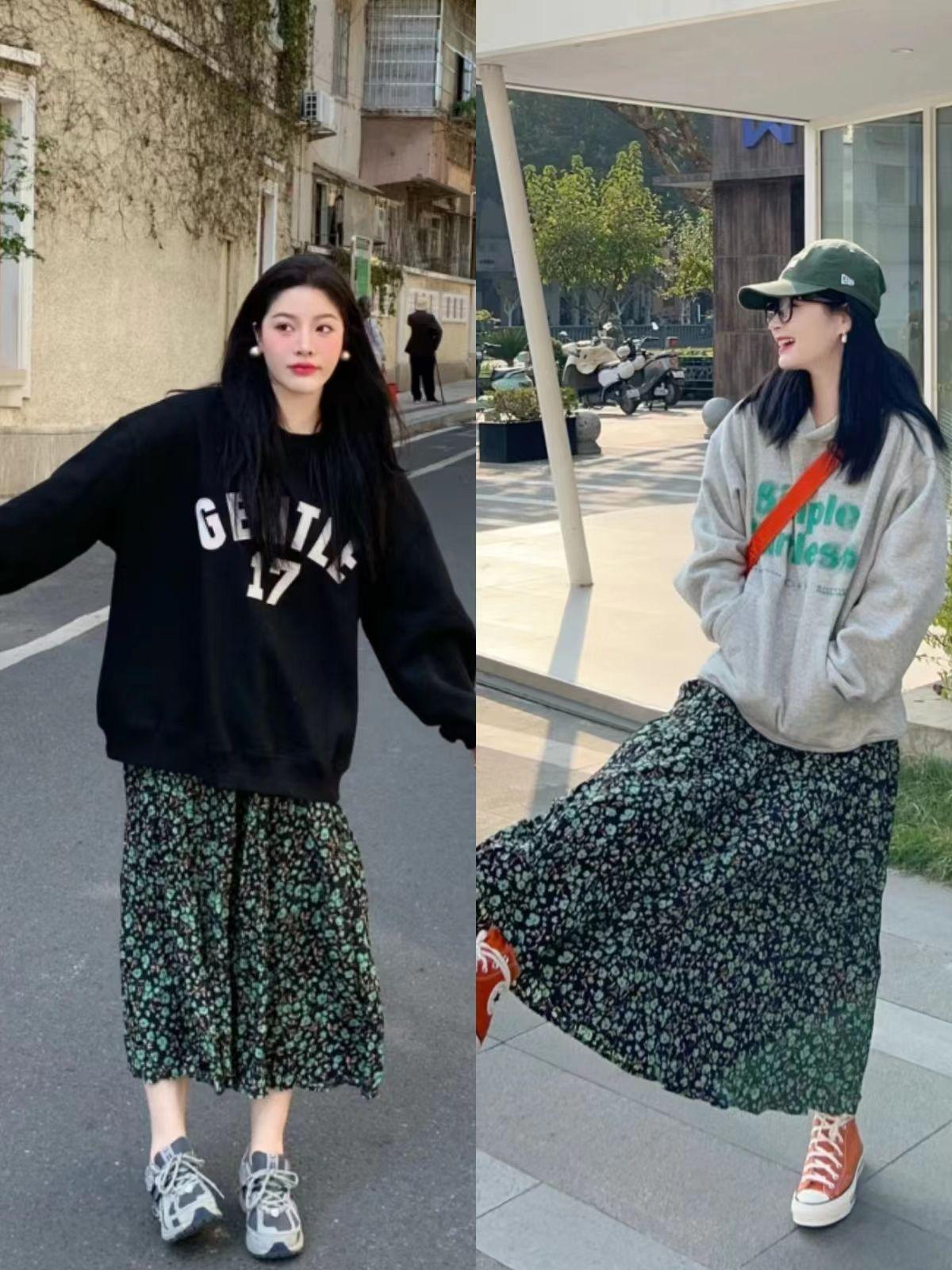 Floral skirts and sweatshirts express an elegant and romantic style, full of girlish flavor. Maybe some people prefer a simple and elegant casual fashion style, so I recommend you choose a black long skirt and sweatshirt. The black skirt is low-key and practical, and can hold sweatshirts of various colors.