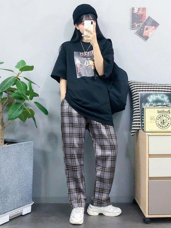 A cool girl, If you don’t like tight-fitting styles, loose styles will have a more obvious slimming effect. Plaid trousers can be said to be a popular style this year, and they are full of fashionable charm when paired with dad shoes.