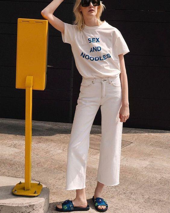 Compared with solid white T-shirts, letter T-shirts will have a better visual effect. A simple white letter T-shirt paired with high-waisted jeans and dad shoes is full of sporty style.