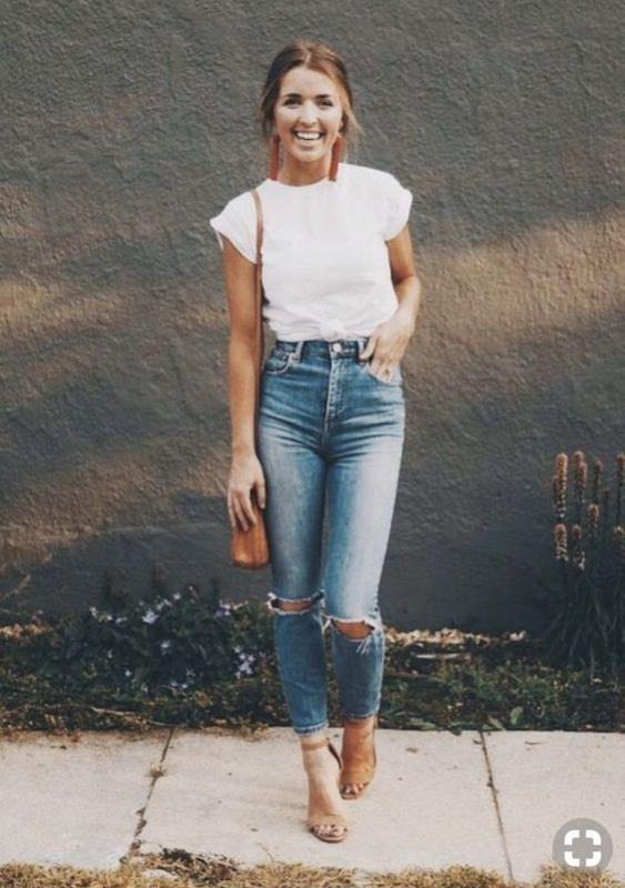 The sleeves of this white T-shirt are relatively short, and the corners of the waist are tied up to reveal the waist, and the jeans have a tight fit. The ripped design is both individual and fashionable. Paired with apricot-colored high heels and a small bag, it is especially suitable for working women.