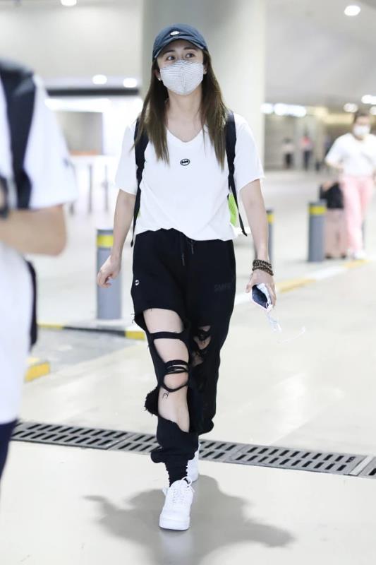 As for the shape of the pants, although the style of the ripped pants is a bit messy, Liu Yun looks very fashionable when wearing them, which also illustrates Liu Yun’s matching ability and Fashionable and charming, the overall style of this outfit is casual, but it is not too casual. It can be said to be a simple and casual outfit without losing the femininity.