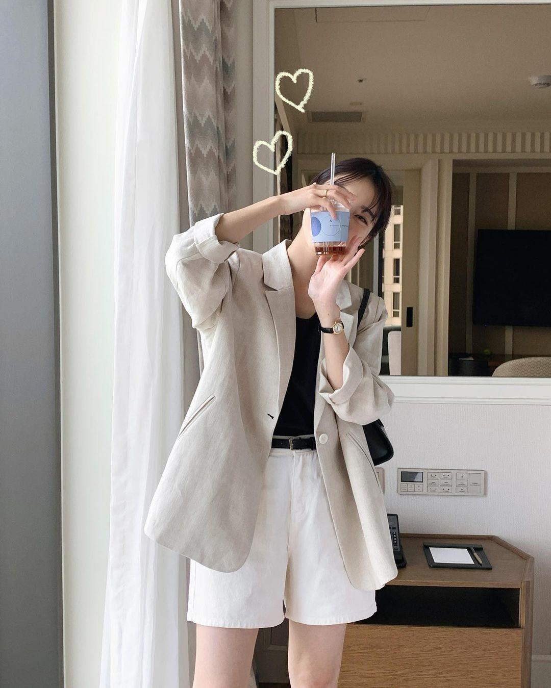 As for inner wear, she adopted a black T-shirt and white shorts scheme, using the strong color contrast between black and white to enhance the overall visual impact. , if you observe carefully, you will definitely find that the material of the T-shirt is relatively soft, while the material of the shorts is obviously stiff, which can also have a contrasting effect to a certain extent. Half gentle and half capable, this is the workplace What an attractive woman should look like.