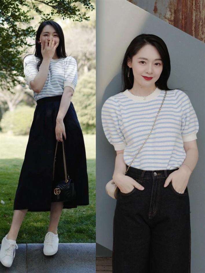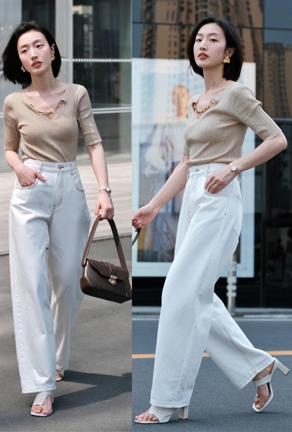 The style of Grandma T-shirt is mainly slim-fitting. It can not only outline the figure curve of the upper body, but also easily show off the small waist. The style of wide-leg pants is mainly loose, which can not only cover the fat on the legs, but also hide the problem of uneven leg lines. The characteristic of a pear-shaped figure is a thin waist and thick legs. Therefore, I say that the matching method of “grandma T-shirt + wide-leg pants” is tailor-made for the pear-shaped figure. No one can refute it.