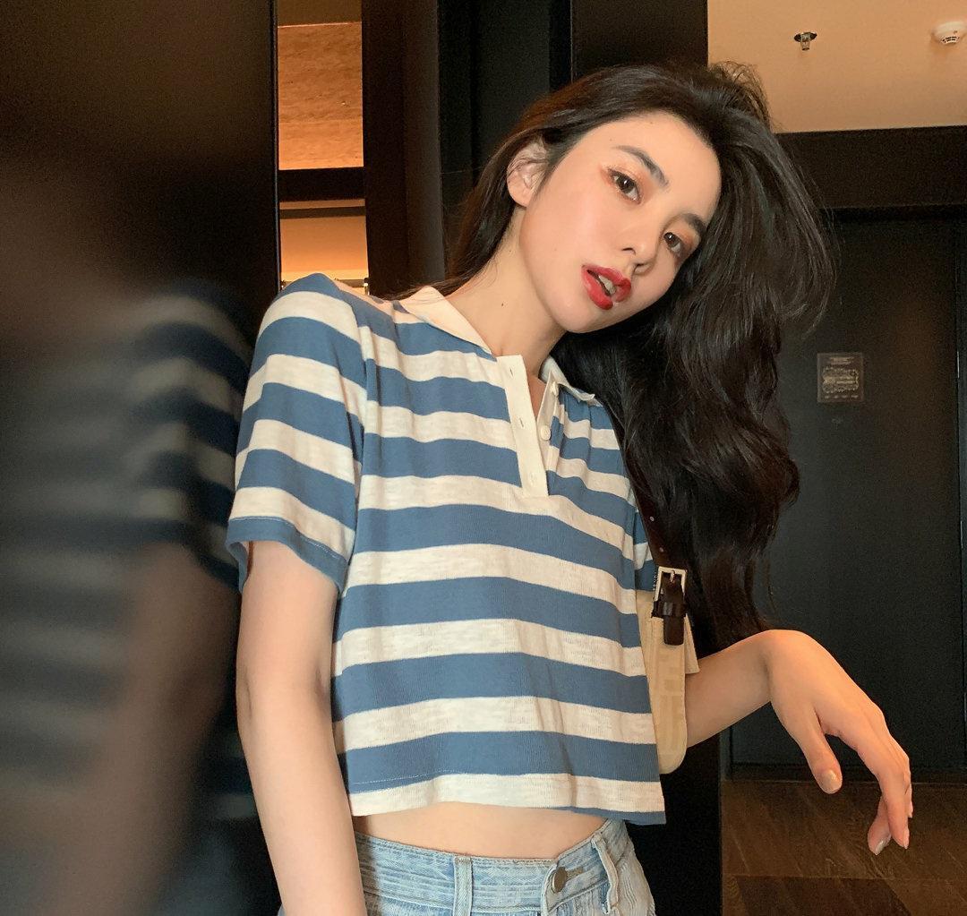 If you think a white short T-shirt will easily lead to dullness, you might as well change the white to stripes. Her fresh stripes are a type that girls with a royal style like very much, and they are also a Polo shirt that men often choose. Style, if you wear the same T-shirt with your boyfriend, you will get a high rate of turning heads when walking on the street. Paired with wide-leg jeans, you will look like a sexy little girl who loves fashion and trends.