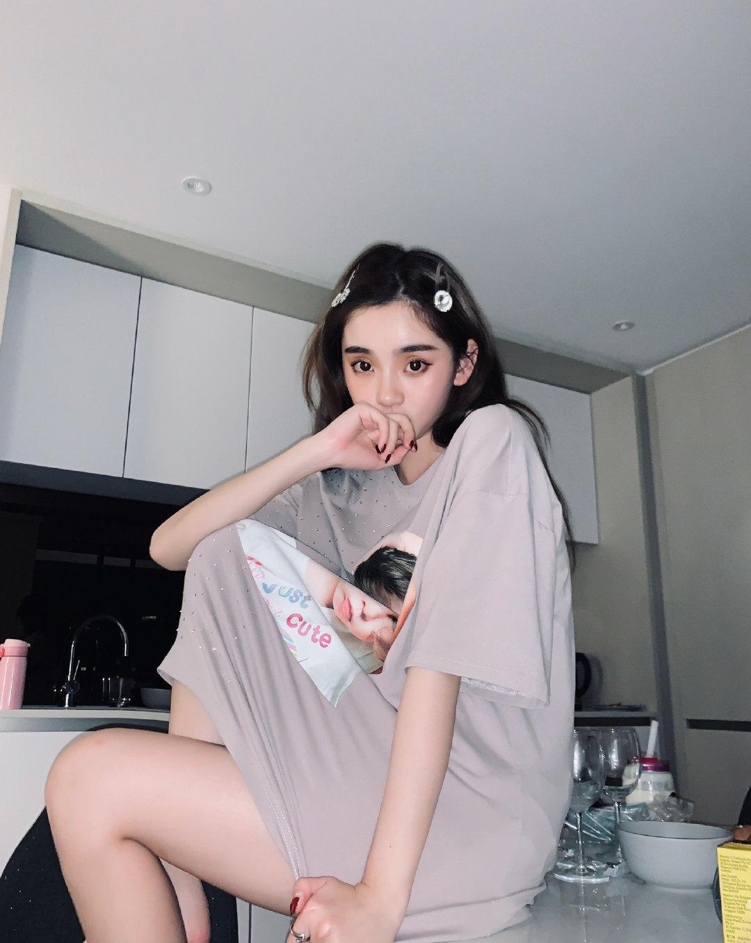 Mid-length T-shirts can be designed as T-shirt skirts. In fact, many sexy girls will wear short jeans with raw edges on their lower bodies. This further reflects the three-dimensional effect of the clothing, and can also be matched with the style of disappearing underwear. Her light gray clothing uses a large character avatar on the chest, allowing the sexy goddess style to be revealed.