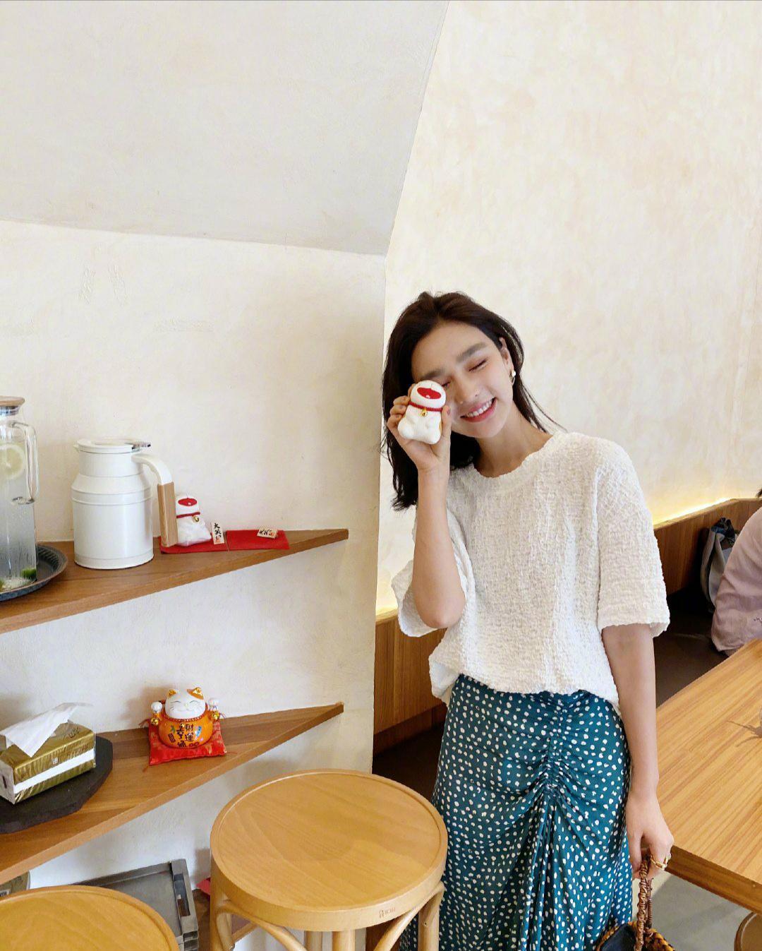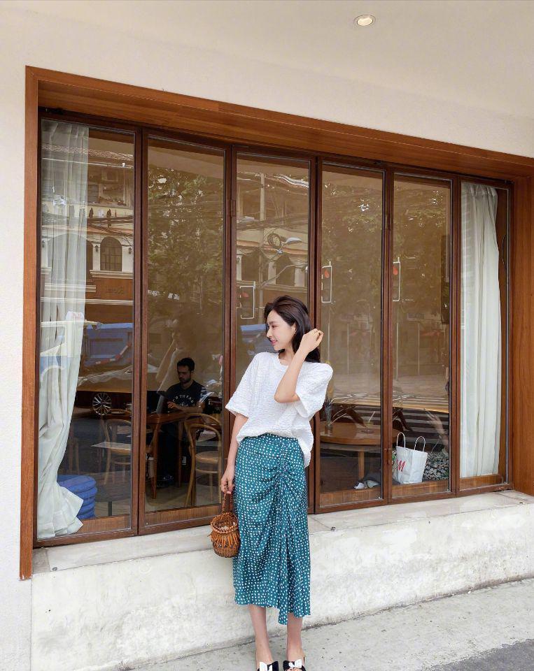 Fabrics with a texture similar to silk will appear It has natural charm, and this kind of fabric will also make the trend of clothing more obvious because of its personalized design, and it can also add breathability. If you don’t like the traditional T-shirt, you might as well use this improved version to look more fashionable. The dark green long skirt she chose on her lower body added white polka dots to it to create a fresh look, while using pleated and tightened shapes on one side to look sweet and stylish.