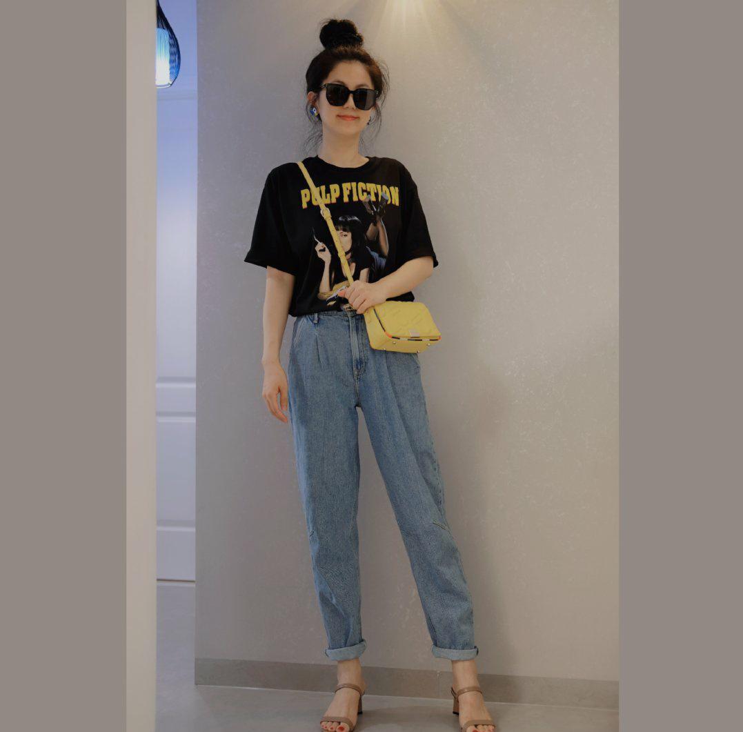When it comes to classic T-shirts, of course they cannot be separated from the two tones of black and white. The black T-shirt she chose has personalized characters and Simple letters, this kind of combination with obvious typography will reveal the high-end sense and big-name style of the clothing. In fact, although such clothing is relatively classic and simple in style, it is easy to match it with fashion charm, and it is also very versatile. As for the items to wear, you can choose a short skirt or a mid-length skirt for the lower body, or you can choose a pair of comfortable jeans made of Tencel fabric like her.