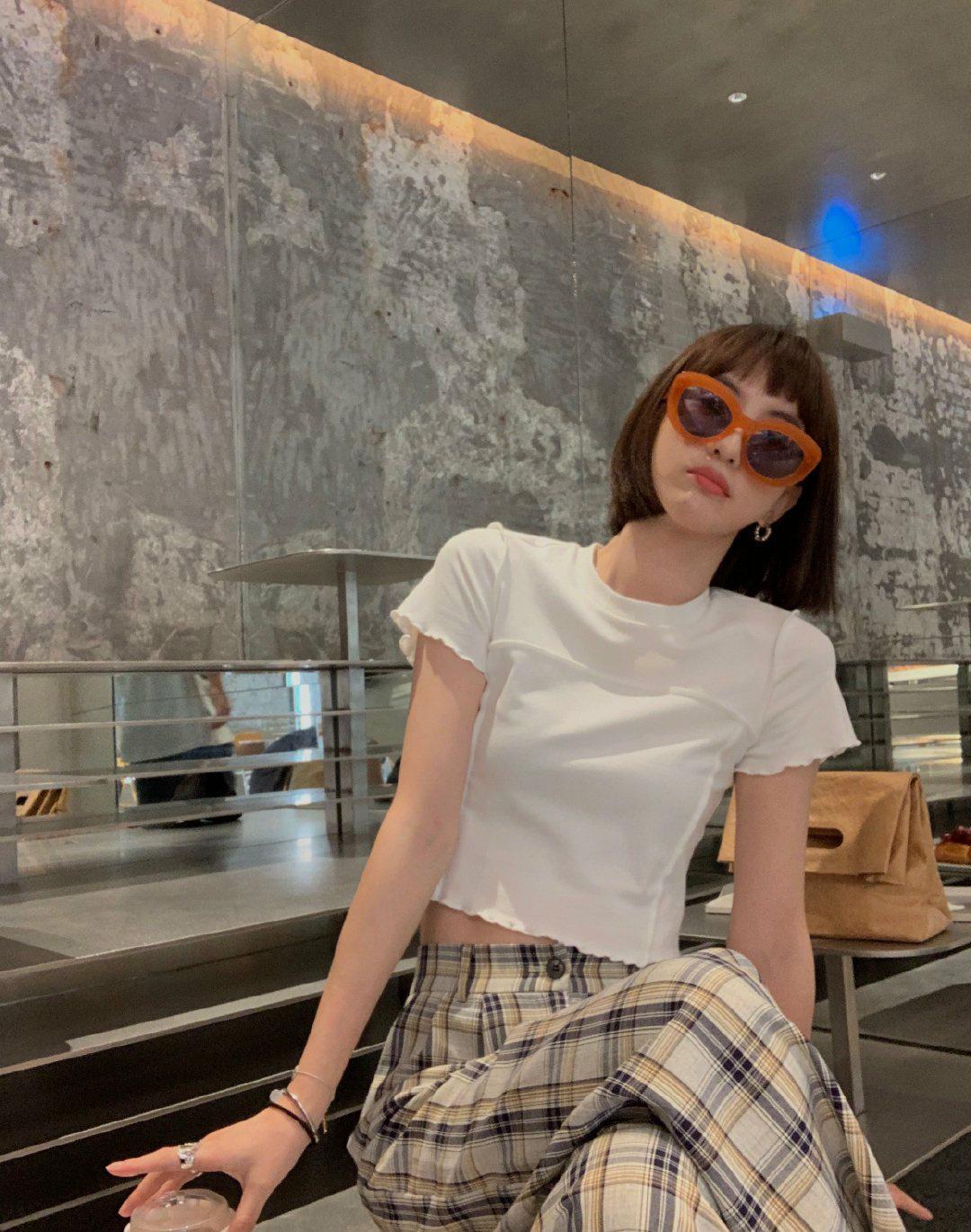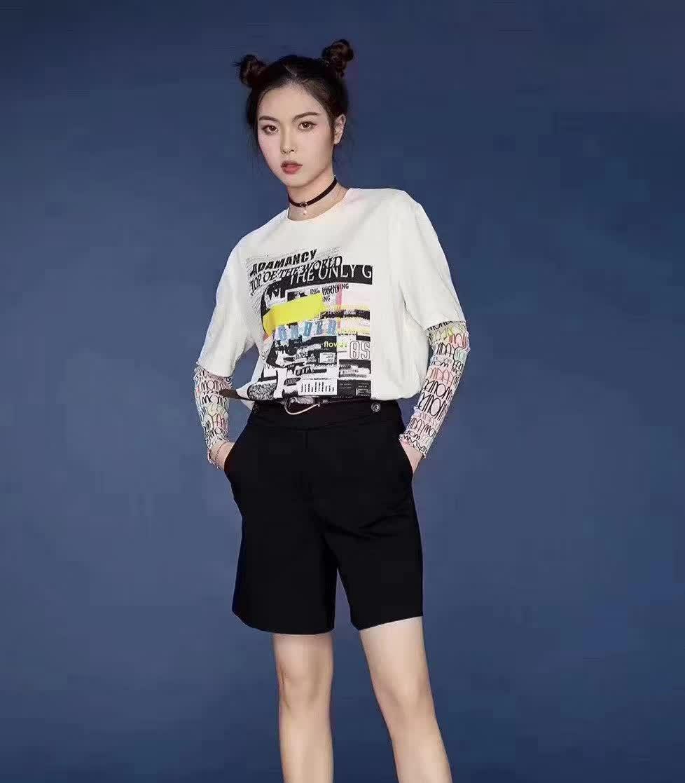 New items for personalized T-shirts appear every year. Double-layer is very popular this year. The T-shirt she chose seems to have a layer inside. A sun protection sleeve. This thin sun protection sleeve will not cause stuffiness, but it can provide sun protection and reveal the layers of clothing. There are many geometric figures added to this sleeve. Although it looks simple, it is But it is very trendy. With the quarter shorts and Nezha hairstyle, she looks like a trendy street girl who likes simplicity.