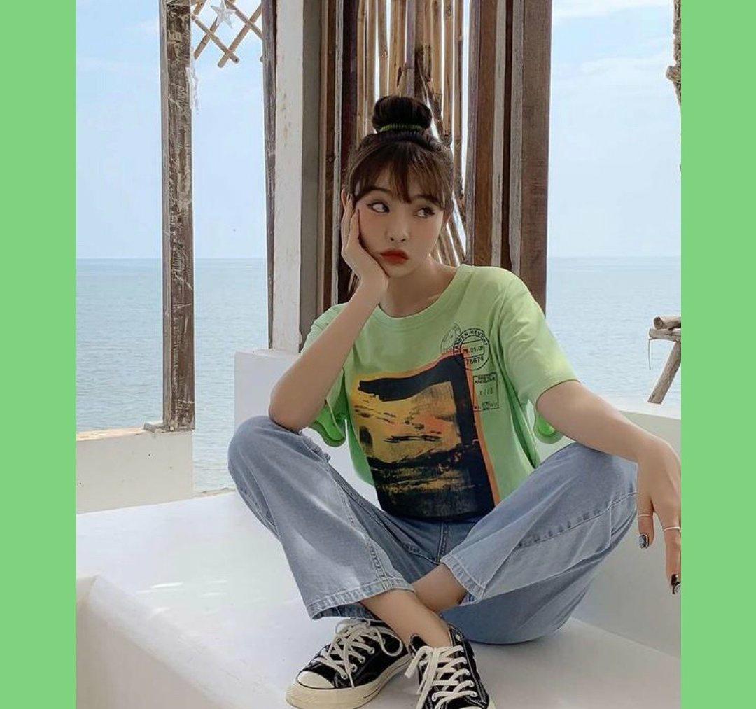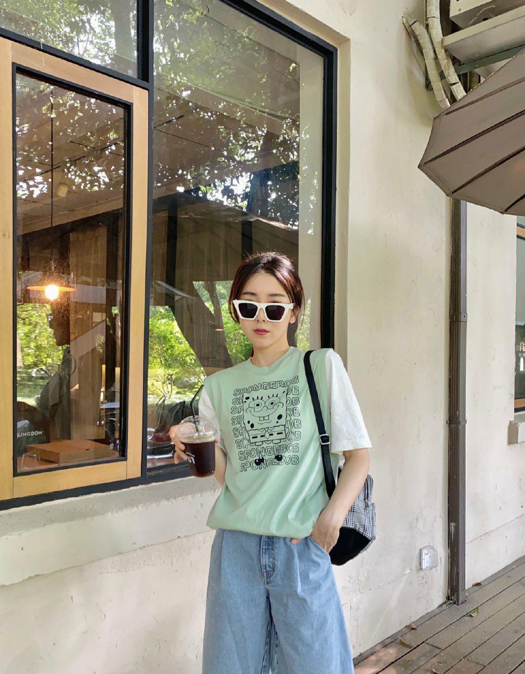 T-shirts in fresh tones are easy to match with a fashionable effect. The grass green T-shirt she chose will be eye-catching. In fact, this kind of clothing does not choose a girl’s skin color. Instead, it will brighten the skin color because of the cool colors. Even girls with dark and yellow skin will always look good in such clothing. The specific style can be reflected through the graphics embellished on the chest of the T-shirt. If you want to create a handsome style with such clothing, you can try dark-colored jeans on your lower body.