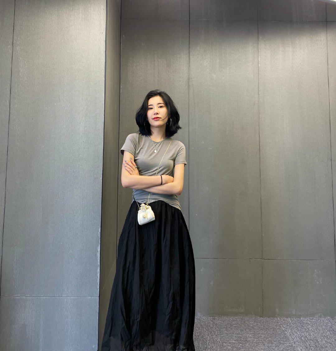 When mature sisters choose T-shirts, if they want to make their sense of age reduction stronger, they can choose the regular version. If they want their mature charm to be naturally exuded, You can use some irregular tailoring. Her clothing uses a tight-fitting design on the chest and shoulders, which reflects the three-dimensional shape of the upper body and the sexiness of the figure. The slanted and irregular pleats are used on the hem to make the clothing more sexy. The sense of fashion has become particularly strong. The lower body is paired with a black retro skirt, revealing fashion in a low-key manner.