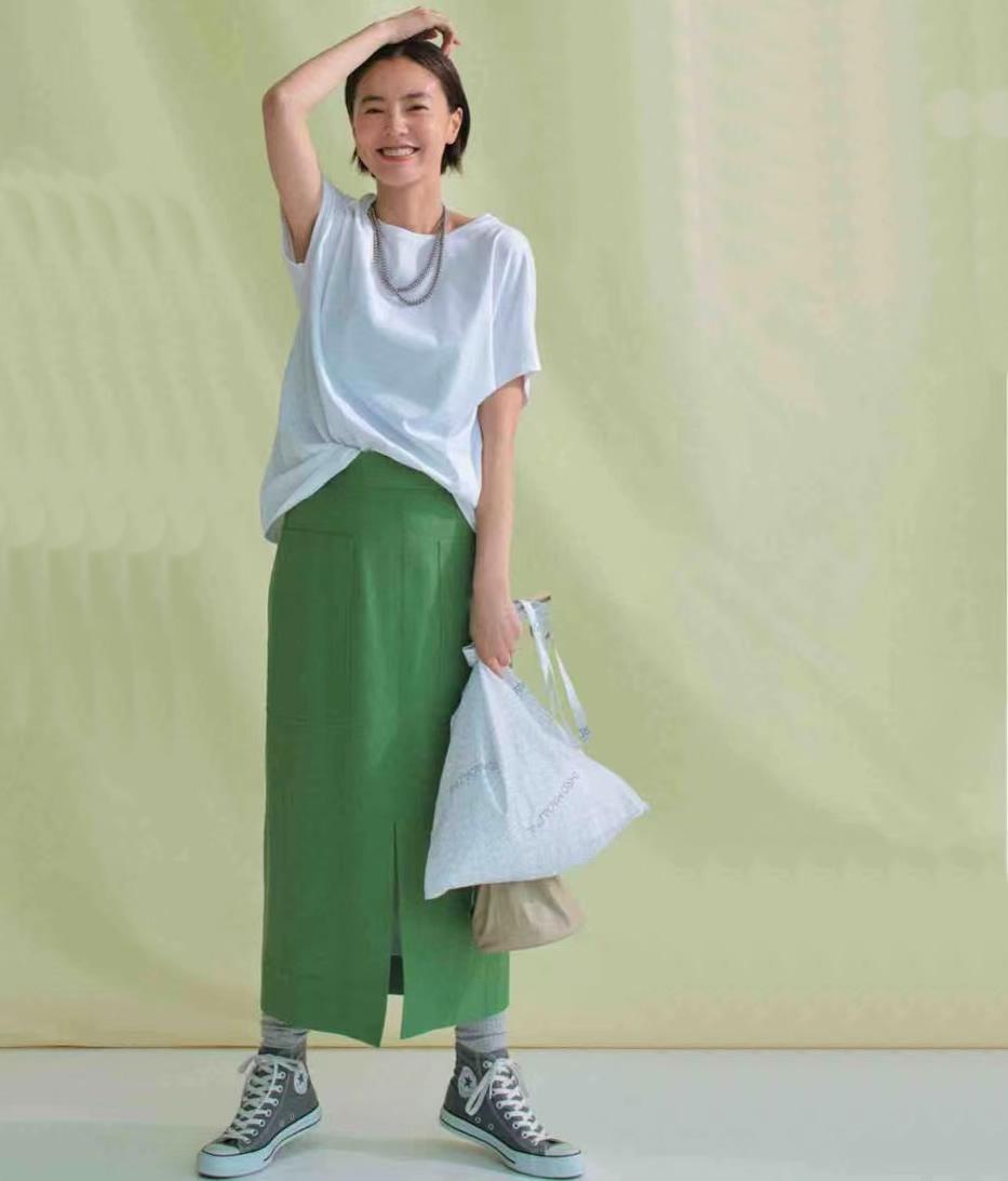 Due to the simple style, the key to stand out is to use upper and lower color matching. Choose a bright skirt with higher saturation for a more fashionable look.