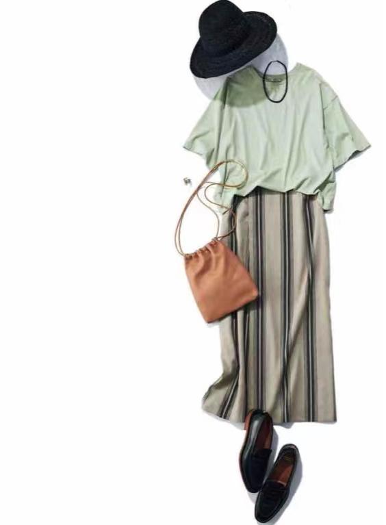 This striped T-shirt is casual and casual, making people think of home wear in every minute. When matching, the H-shaped skirt that can show neatness is the first choice. Take the same beige color as the stripes and use the tone-on-tone premium to win.