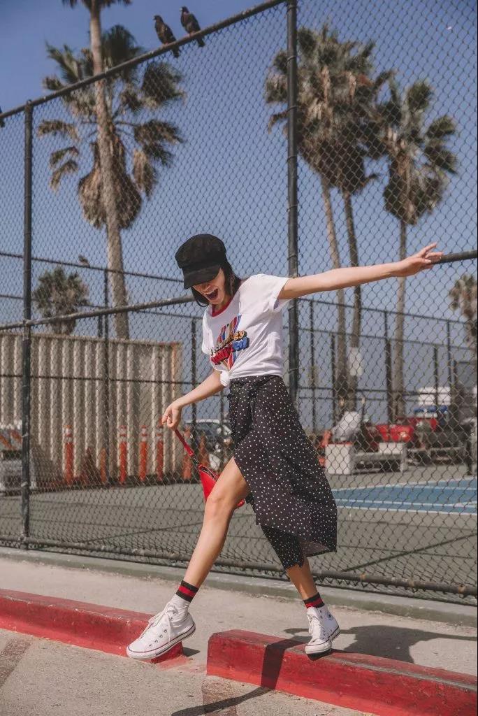 It is said that five T-shirts are not summer, but in fact, there is no skirt in summer. It seems that summer has passed in vain. A simple white T-shirt and a green floral skirt are wrapped around the body. The version is very flattering, and paired with a clavicle chain, it is exquisite and fashionable.