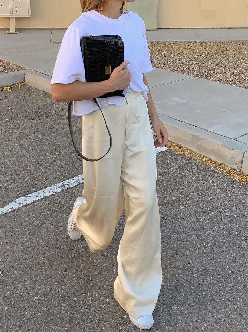 When we replace the wide-leg pants with a pair of satin wide-leg pants of the same color as the white T-shirt, the whole outfit instantly changes. It is full of a high-end texture, and the same color system, one dark and one light, makes the whole outfit more visually layered.