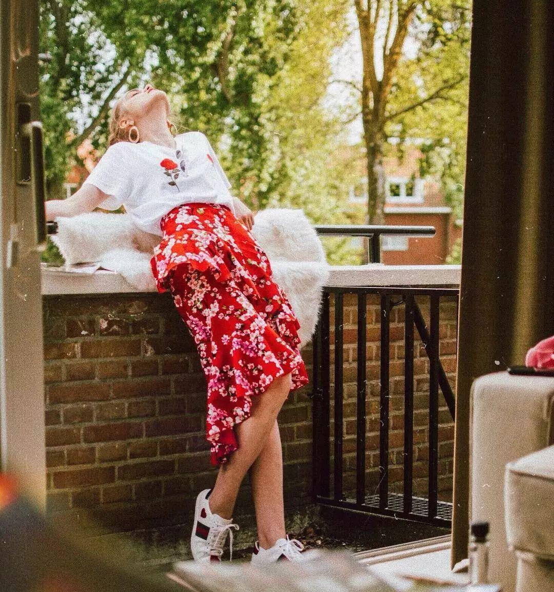 The mix and match of T-shirt and skirt can easily make Your whole body is full of femininity. For sisters with wide hips, it is recommended that you wear this style in the summer, because it can effectively reduce the presence of wide hips, thus having the effect of covering the flesh and making you slim. . The combination of a white T-shirt and a floral skirt also looks more romantic and eye-catching.