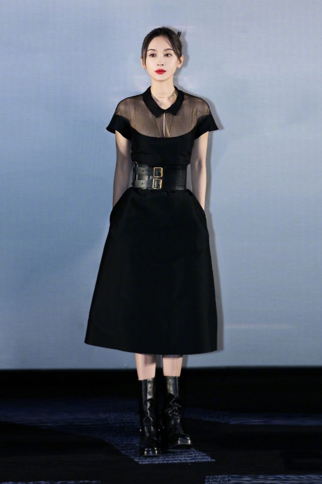 The black shirt dress is elegant and solemn in style, but the one Wang Ziwen chose has a unique sense of personality. A large number of semi-transparent tulle elements are added around the shoulders, breaking the dull feel of pure black and adding a lot of sexy connotation.