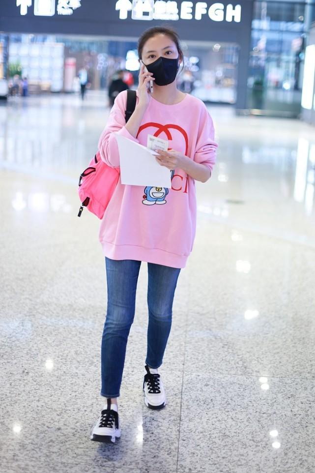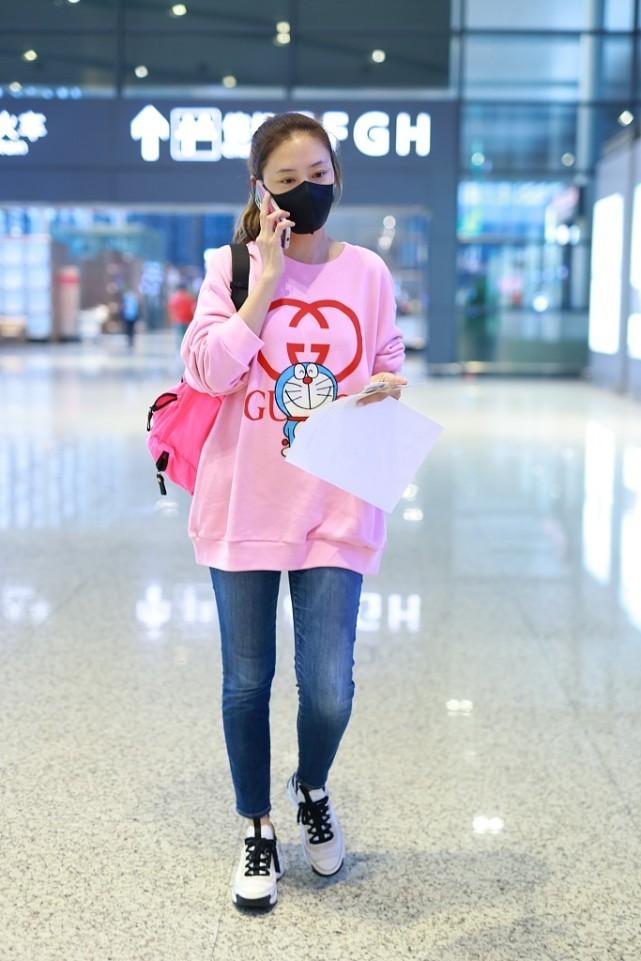 Cherrie Ying boldly chose a pink sweatshirt to look fashionable and girly. The large sweatshirt has a strong sense of presence in the whole outfit, so the overall tone has changed to warm colors, making it The whole person looks younger and more energetic, and the overall shape is eye-catching. In daily life, fair-skinned girls can also choose pink to bring out their lively temperament and make their outfits more eye-catching.