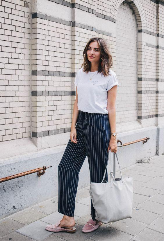 This pair of striped suit trousers can make the whole body look more three-dimensional. The matching slim-fitting short T-shirt makes you look slimmer and taller. The vertical striped trousers lift up the legs, and paired with a pair of mules, they are domineering and suitable for summer.
