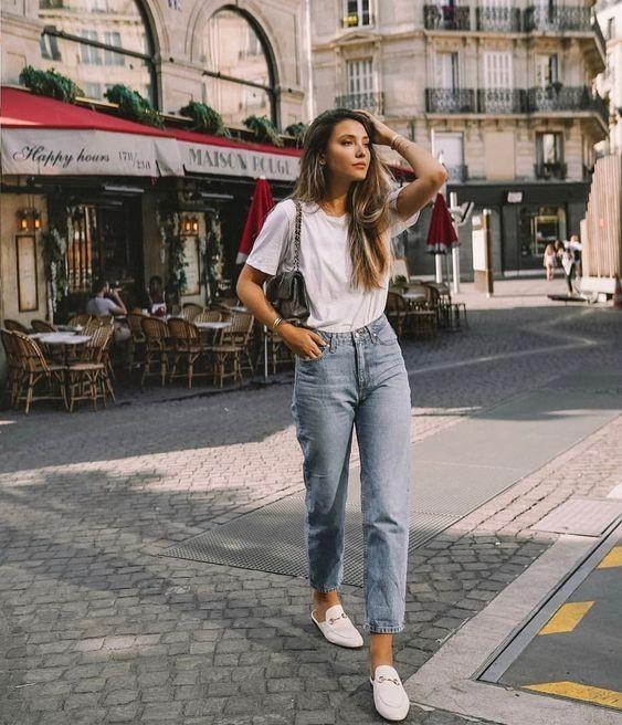 This pure white T-shirt is used to match the same light-colored jeans. The high-waisted version is very slimming. The whole outfit expresses a small and fresh visual sense, and a pair of popular mules are full of street style.
