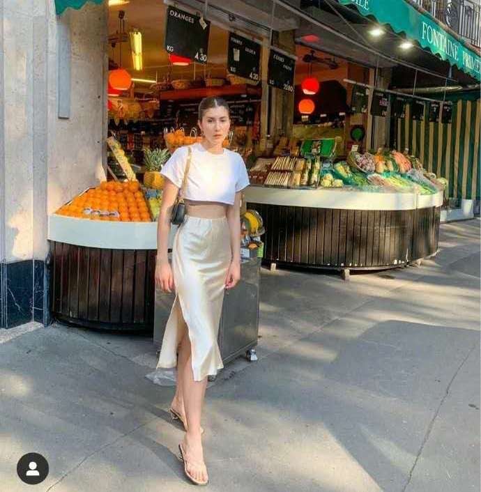 Navel-baring T-shirt + slit skirt, the navel-baring T-shirt hugs the figure, revealing a small waist without any trace of fat. The slit skirt is pure and flirty, you can copy it in Meimei BM style.