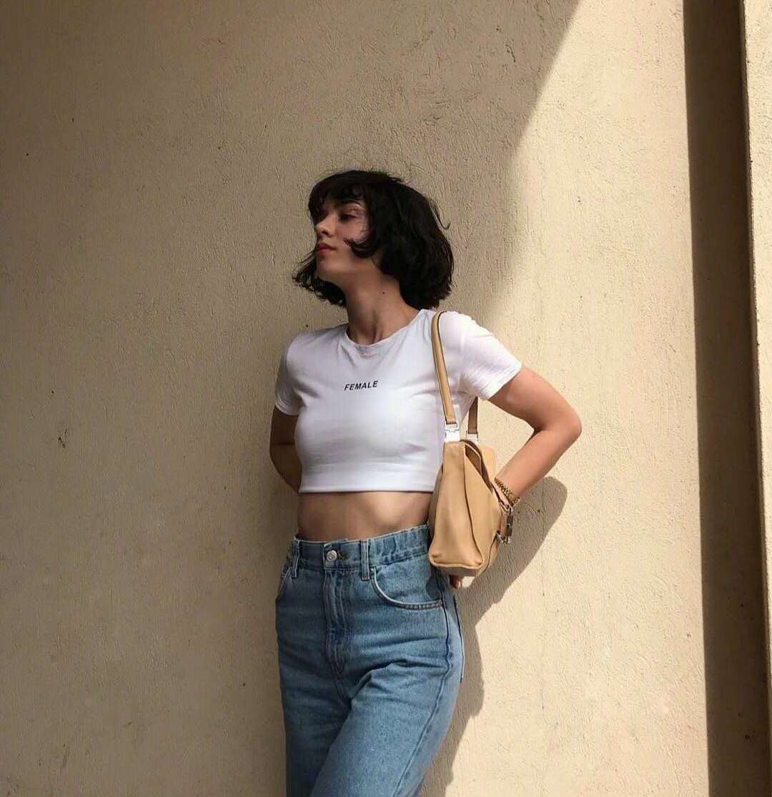 White T-shirt with exposed navel, relatively speaking, it is recommended that when choosing a style, try to choose a slightly tight version, at least not particularly OVERSIZE Version design.