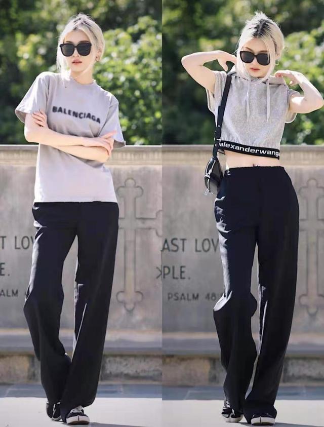 Although the temperature in summer is very high, black cannot be forgotten. Pair a gray printed top with black trousers, which is high-end and individual. This solid color has a high degree of coordination. Paired with a pair of thumb shoes, it looks so stylish and stylish.