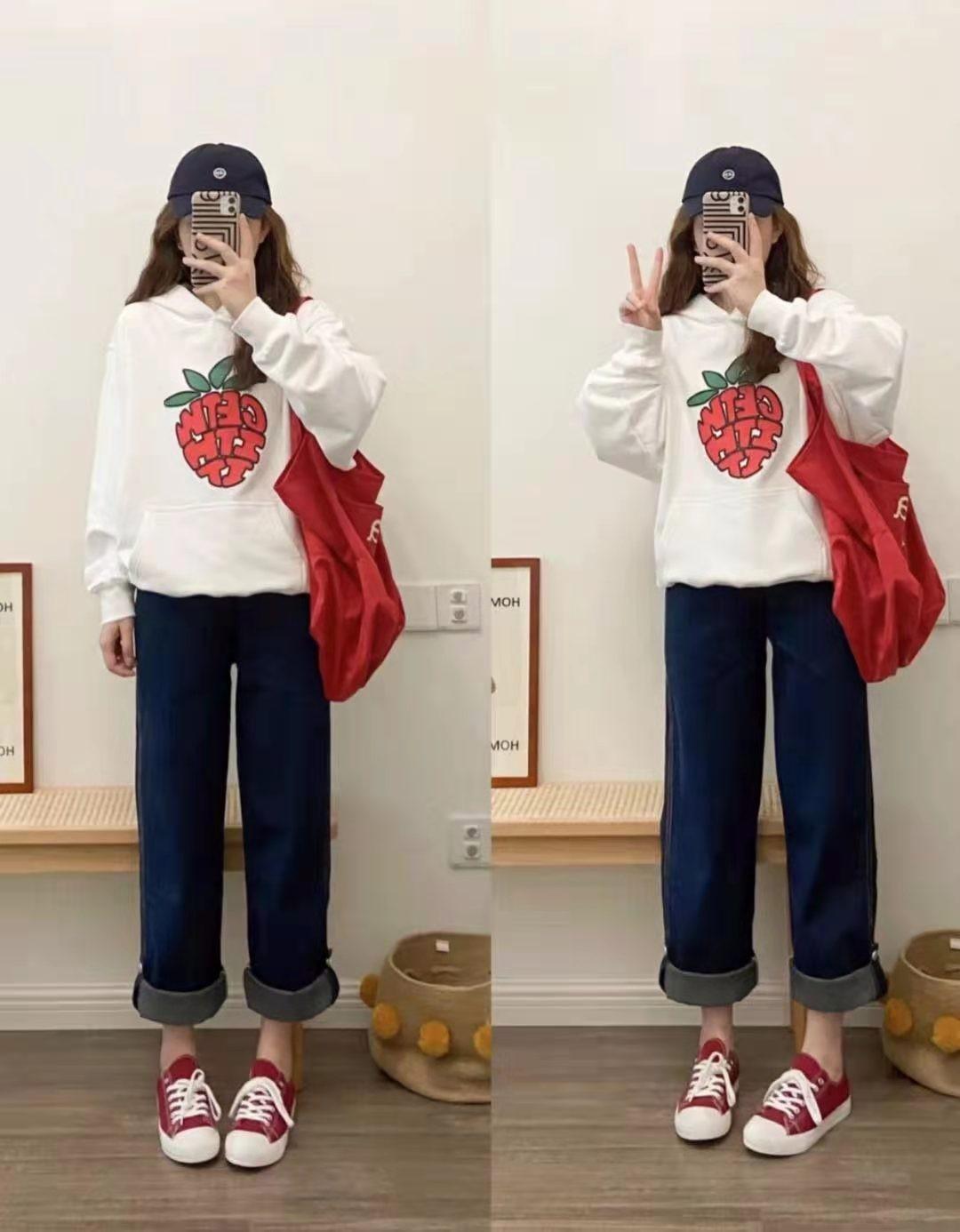 The cute red strawberry sweatshirt uses white as the base, making the whole item look very sweet, and it looks even better when paired with wide-leg straight jeans and red canvas shoes. It makes the whole person look like the little sister next door. A pair of red canvas shoes serve as the highlight of the overall match, which further enhances the style of the entire wearer!