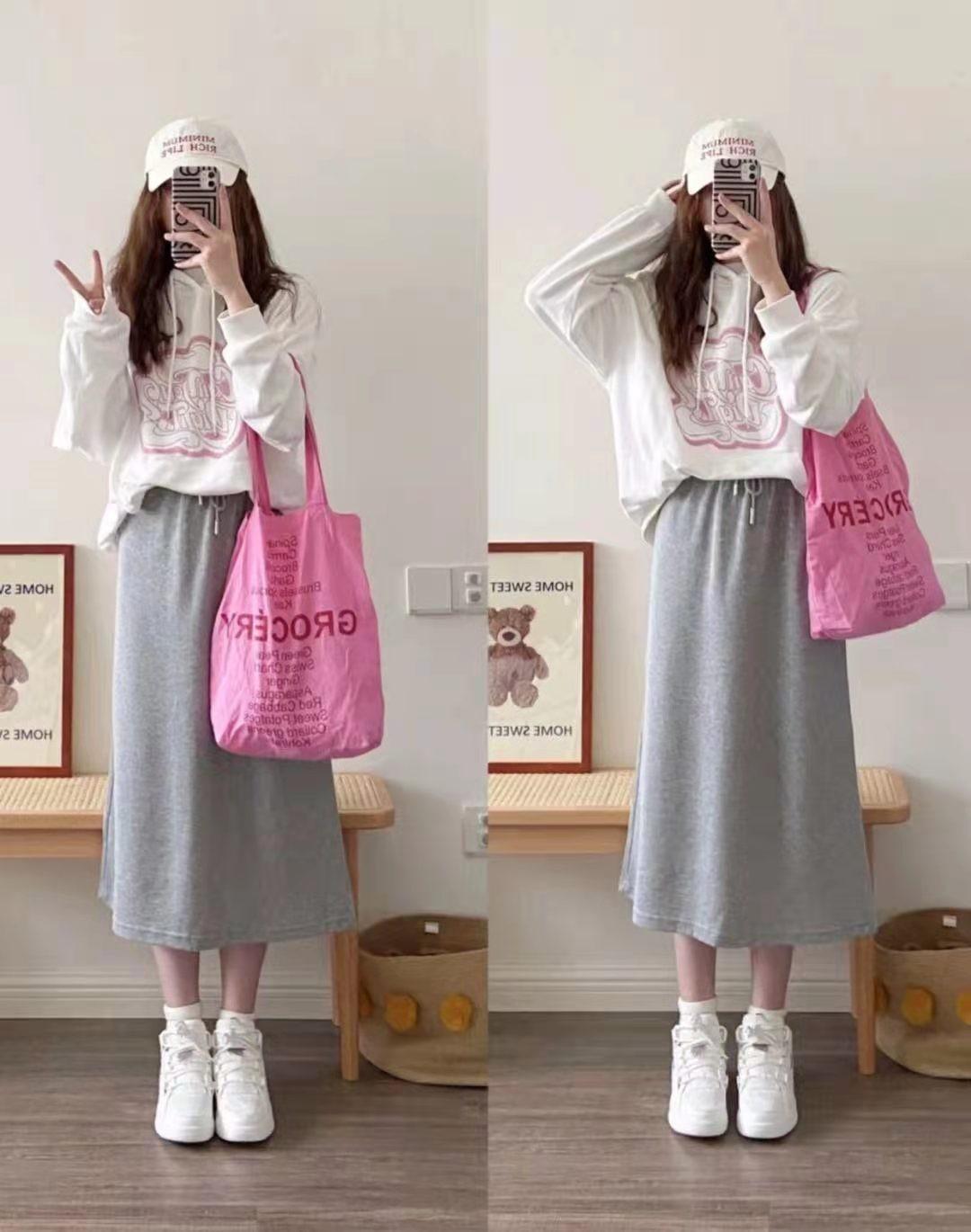 If you want to create a more gentle and lovely image, you might as well try a gray sports maxi skirt. The white sweatshirt with printed letters and pink pattern and this square canvas bag of the same color make the whole person’s outfit look more harmonious and unified.
