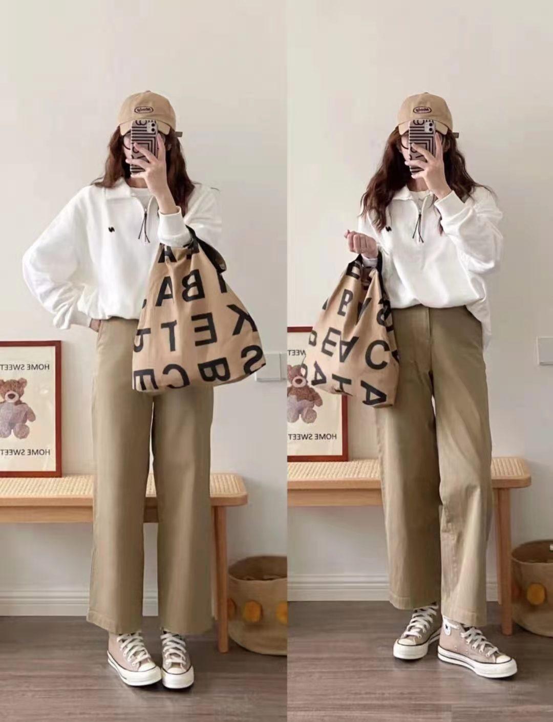The most unique color representing early autumn is brown. This light brown high-waisted wide-leg trousers and the same style of canvas shoes are really eye-catching, and this white simple sweatshirt has improved the overall quality a lot. .
