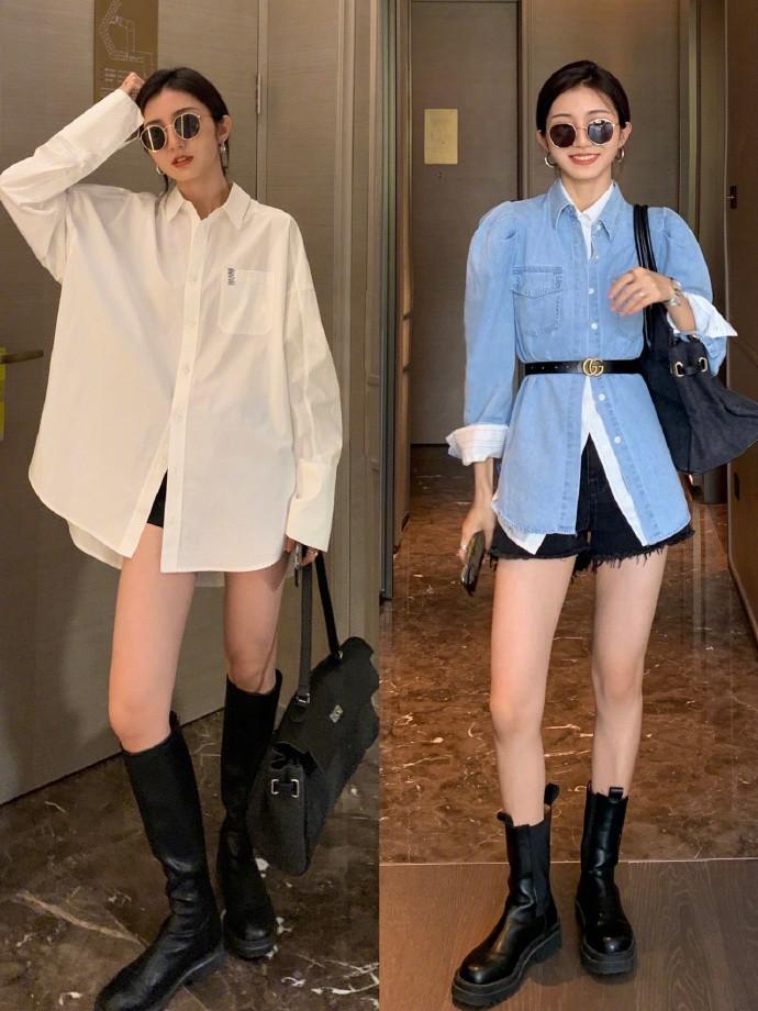 And the denim shirt is also oversized, which will look cool. Paired with black short boots, it can naturally help us modify our figure.