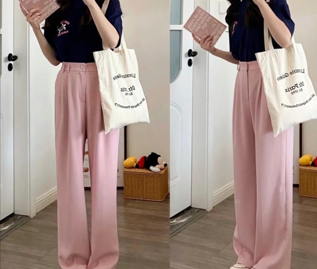 The choice of color for pink trousers does not weaken its ability to cover flesh, but instead creates a more eye-catching color scheme and a more novel image. Wide-leg pants are still very casual and sexy. Paired with a black T-shirt, it is elegant and simple.