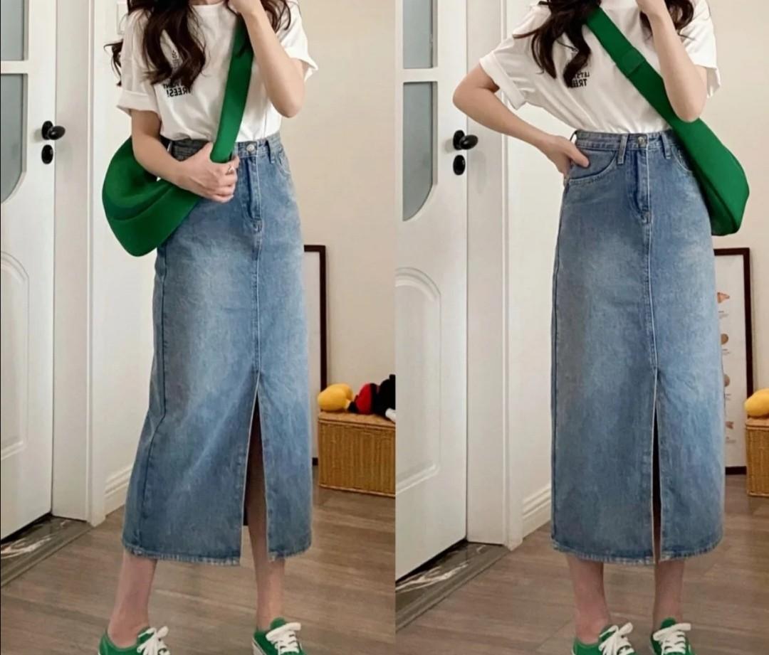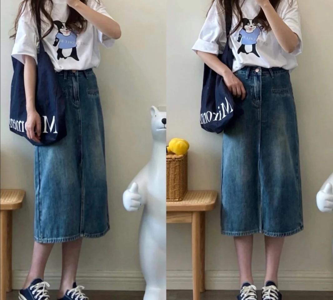 In this group of outfits, the white T-shirt brings a refreshing style, and the blue denim knee-length skirt creates a distinctive look. For the slimming effect, in addition to the refreshing color selection, the selection of single products can also create a flesh-covering effect.