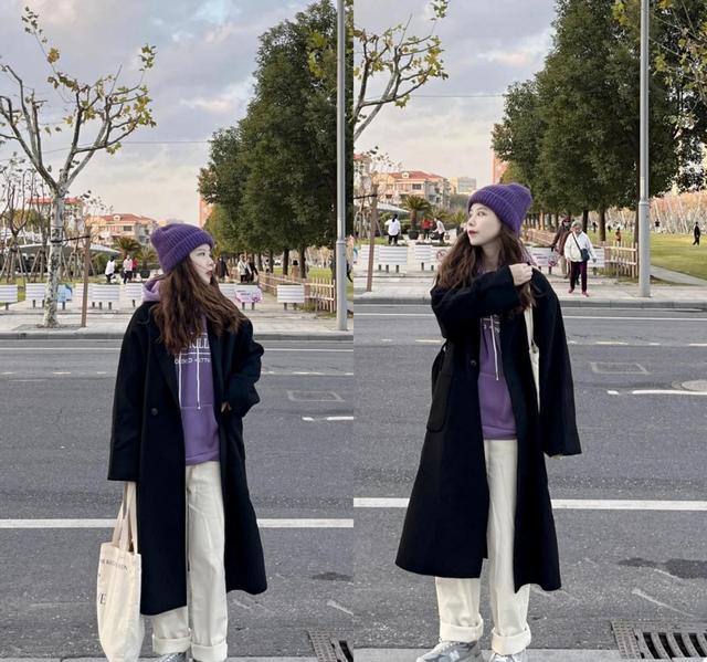 Incorporating other bright colors into the look can help create a breakthrough, such as the combination of a black long coat and a purple hooded sweater, which is naturally more To reduce age.