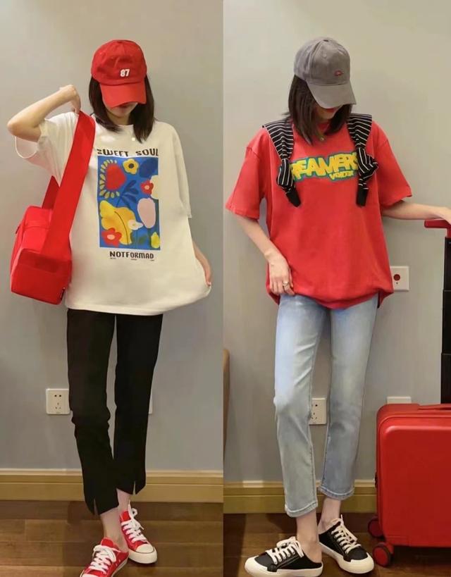 The matching of T-shirts should match the shoes. A red T-shirt paired with red canvas shoes will make the color combination more eye-catching.