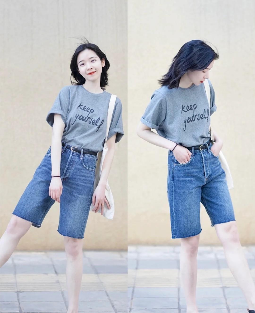 Although blue denim shorts are not as versatile as black, they are not a garment with too many limitations. They can be worn in The upper body is paired with simple T-shirts in various colors. For example, the combination of a light gray T-shirt and jeans is very energetic.