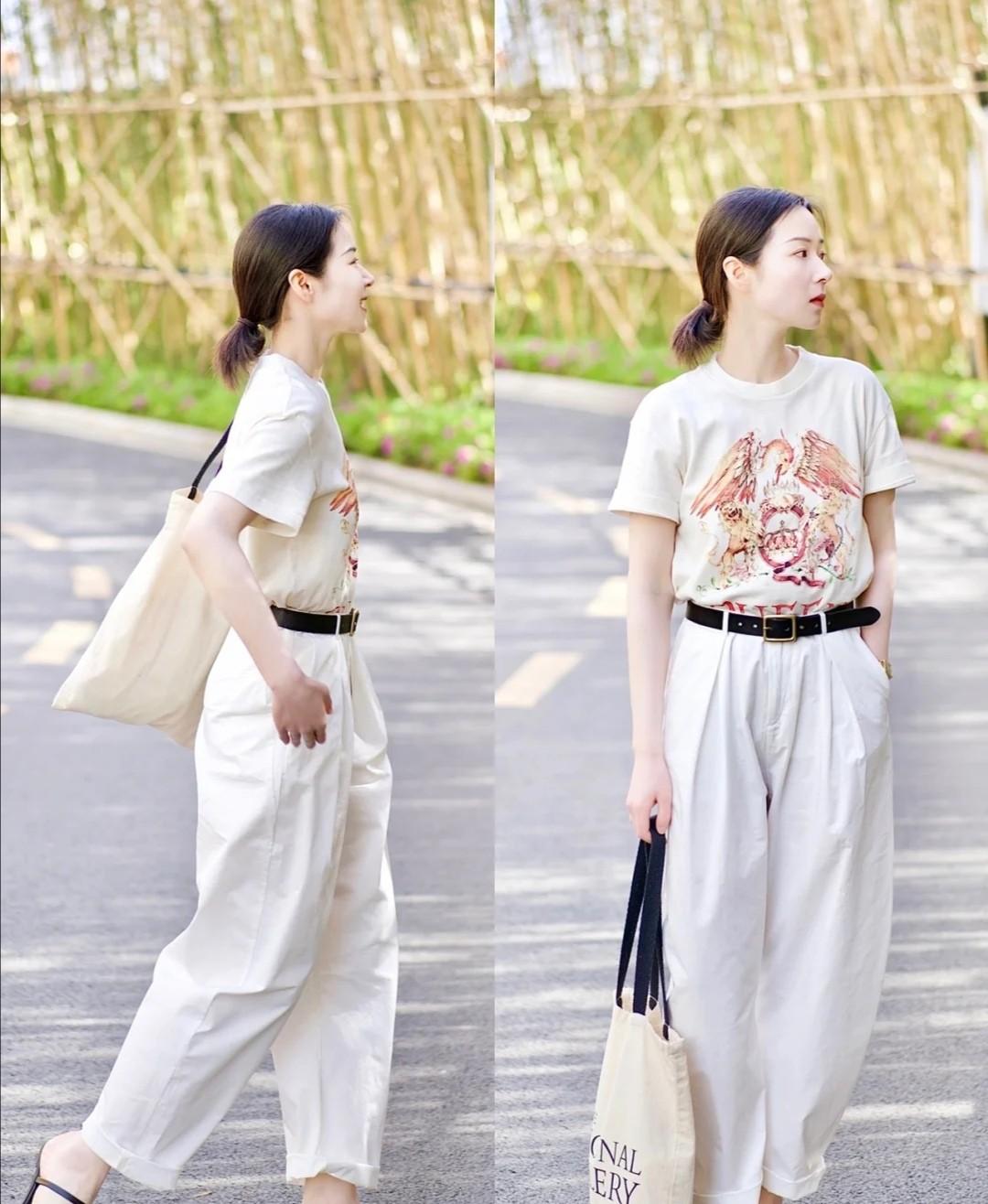 For example, these white wide-leg pants are absolutely fresh and a classic piece of clothing that can be used for many years. Combined with the upper body Printed T-shirts, keep the same color matching, and it will not be monotonous.