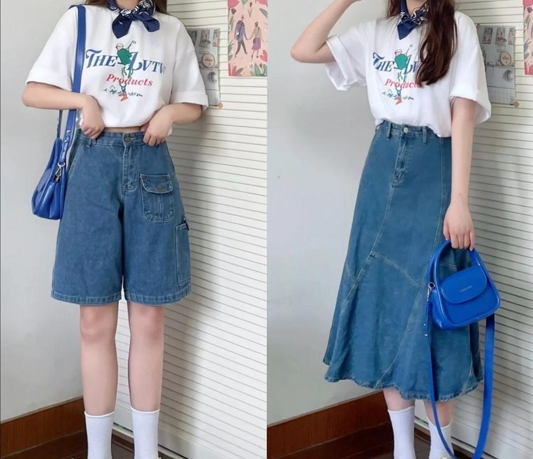 The combination of knee-length skirt and T-shirt can be focused on Using a blue denim over-the-knee skirt, the fabric is classic and of good quality, and it can also enhance your age.