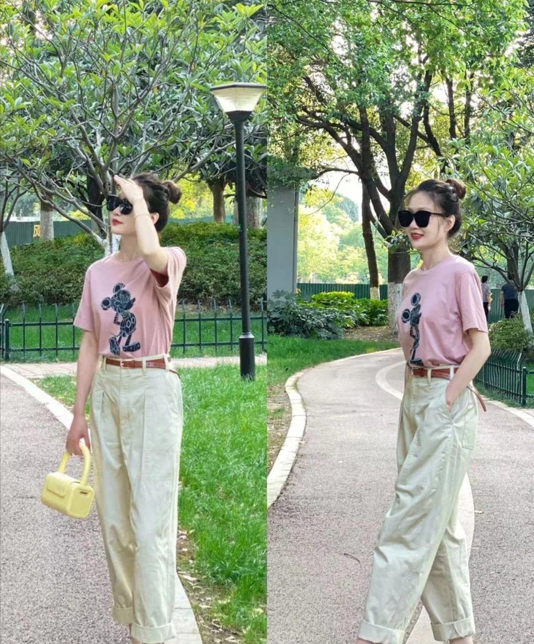 Pink printed T-shirt, the light pink color is very suitable for girls with fair skin to try, and can bring a clear age reduction effect. The color of the trousers that match the lower body should not be too bright, and the saturation should not be too high. White trousers should be the main color, which will look more refreshing.