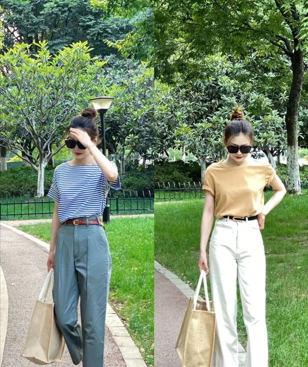 Two T-shirts, the blue and white striped T-shirt maintains the most refreshing look, and the yellow T-shirt has a bright style and energetic atmosphere. They can be paired with trousers with a clear sense of neatness. The dressing style will not be the same, and it can also give a refreshing effect to T-shirts.