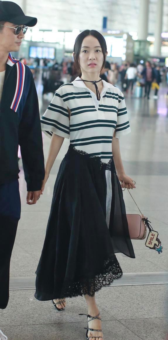 Huo Siyan is wearing a spliced skirt. The POLO shirt and gauze skirt are spliced together, showing a variety of temperament and charm. The POLO shirt is a striped style, and the black stripes show a refined and simple design. Features, obvious decorative effect, outstanding fashionable atmosphere. POLO shirts were originally sportswear, so the design is simple, with a prominent casual feel, and a strong neutral style.