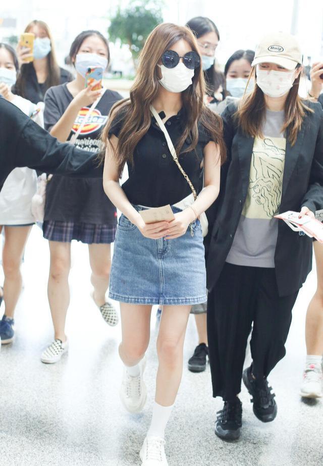 Zhao Lusi is really a cute and trendy girl, even wearing denim skirts is very attractive. Zhao Lusi’s denim skirt is too slim, and the black POLO shirt is simple and neat, and has a really good temperament. Zhao Lusi’s matching is fresh and simple, but the design of neither the POLO shirt nor the denim skirt is simple, so the overall matching trend is very prominent.