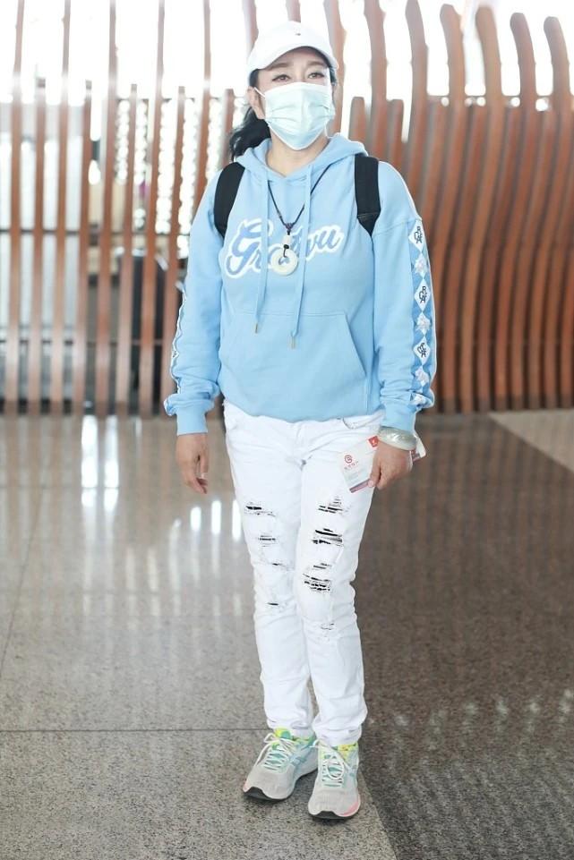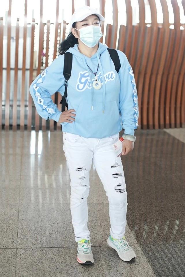 Looking at Liu Xiaoqing’s state, who would have thought that she is an out-and-out post-50s generation? The dazzling blue sweatshirt is combined with white jeans to create a super youthful color scheme. There are also sports shoes to enhance the sense of youth. If you dare to wear it, you can still wear it, even more outstanding than young people.