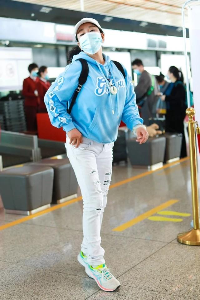 Sweatshirts and jeans are old partners in fashion matching. On this basis, Liu Xiaoqing chose more personalized ripped jeans to enhance the trend and make the matching more outstanding. . The tear holes on the thighs and knees greatly alleviate the monotony of the pure white color scheme, and also enhance the youthful atmosphere, creating a quite youthful appearance.