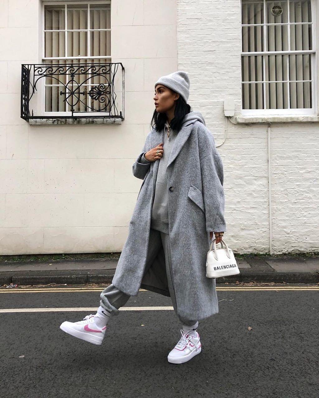 The main feature of this outfit is the combination of a coat and a bag. The bag has sharp edges and corners and looks a bit aggressive, especially when paired with it. The black sweatshirt is very aura in terms of color. It is paired with gray sweatpants and sneakers, which also has its own vitality. This simple color matching is also super stunning.