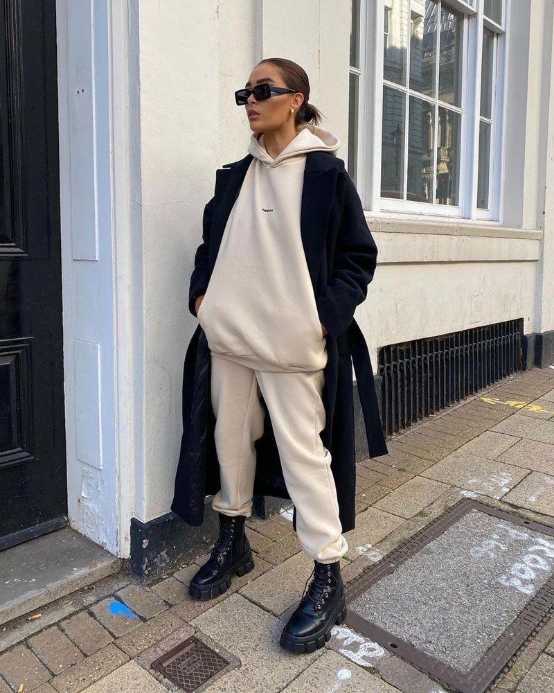 A white sweatshirt and white pants are still very clean and look very refreshing. You can choose to pair them with Martin boots, which can lengthen your legs. The lines make the overall body proportions better, so choosing an extra-long coat will make you more aura.