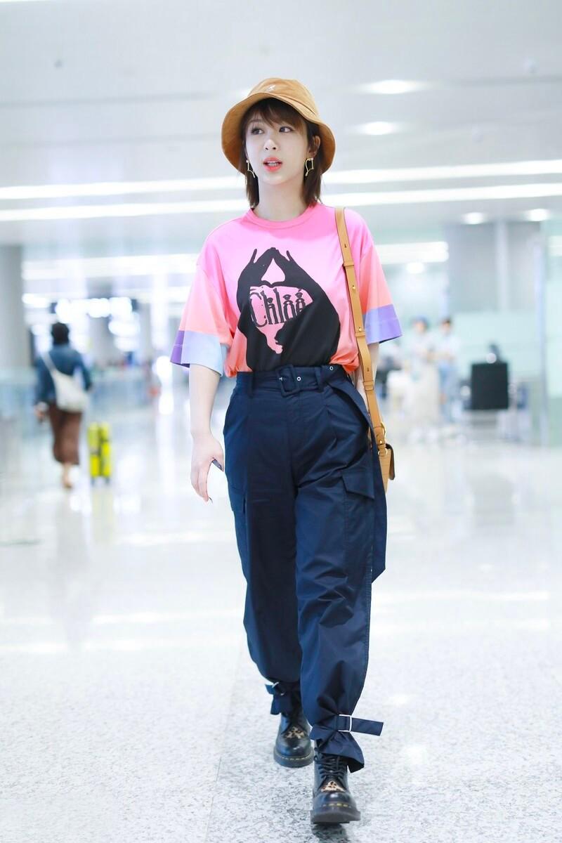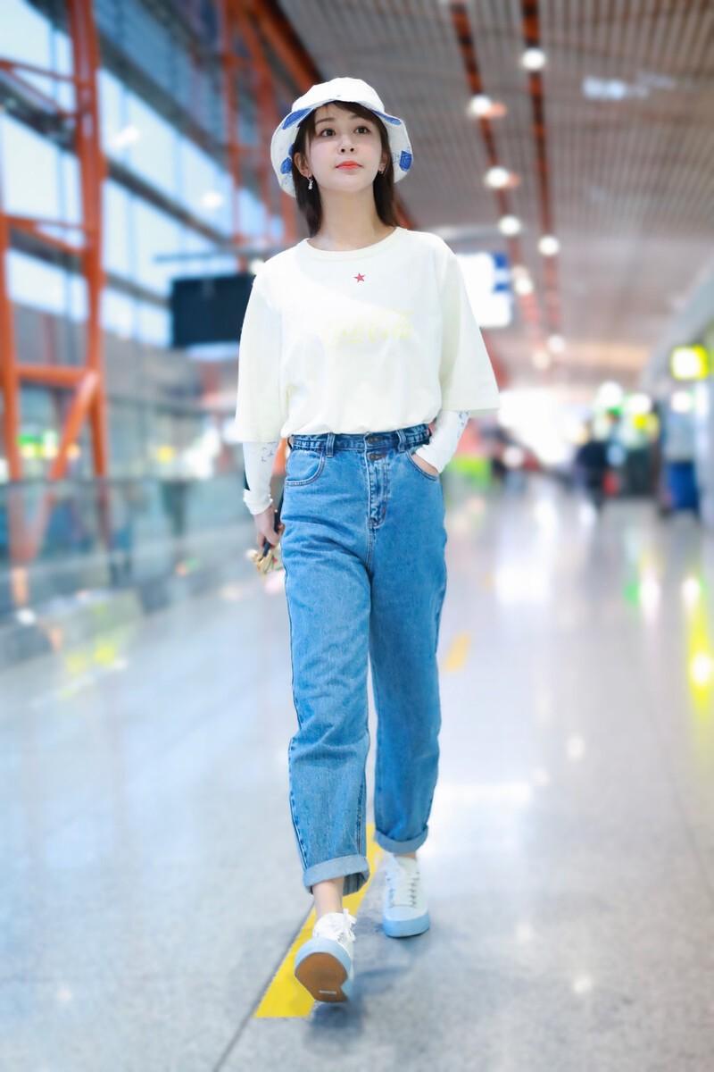 Pants are a popular button-down design, which can heighten and lengthen the legs while being careful. The solid-color printed T-shirt adds a sense of childishness. Yang Zi is really suitable for such a sweet and cool outfit, and the whole person is full of charm.