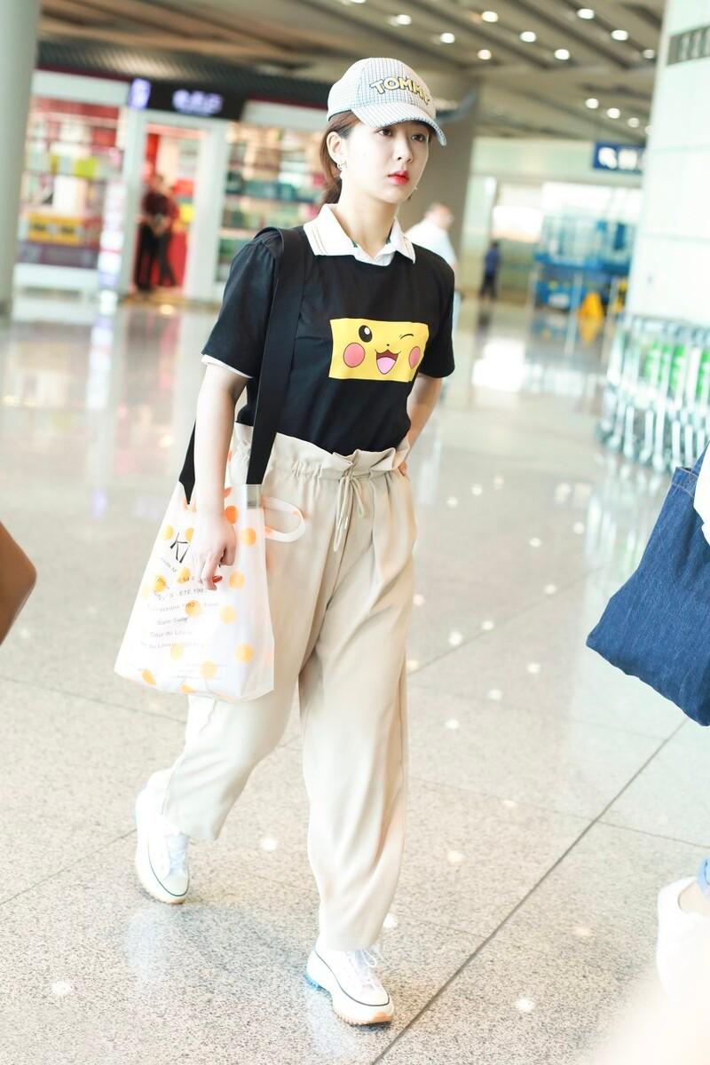 The black T-shirt has a Pikachu pattern on it, which makes this outfit a lot more youthful and lively. Paired with khaki light-colored pants, it looks very youthful, especially the lotus leaf pleats on the waistband. The design is very eye-catching, and paired with a simple canvas bag, it feels like you are back in college.